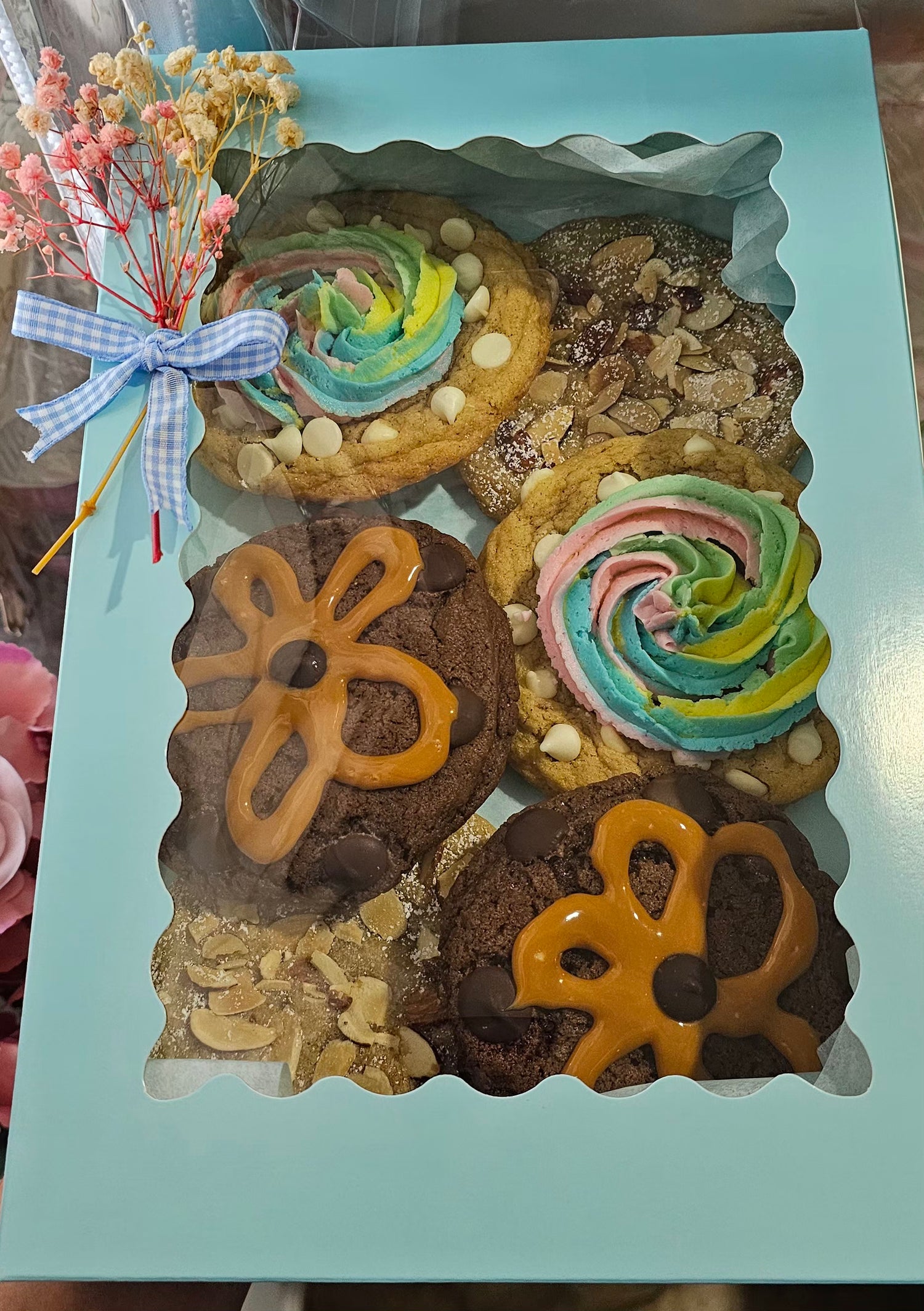Today's menu March 27, 2026: We have our Easter Collection 🐣. A Spring variety of light, yummy cookies, for a wonderful treat. Enjoy two crispy roasted almond cookies, two Ghirardelli 60%cocoa chocolate chip, dulce de leche cookies, and two butter Ghirardelli white Chocolate chip rainbow buttercream cookies. Each box has six, 5 oz. cookies! All packaged with care, in beautiful pastel colored boxes, gently, decorated with Springtime flowers and Easter bows. What a great gift for friends, family, or to treat yourself. Carefully baked and designed with LOVE♡